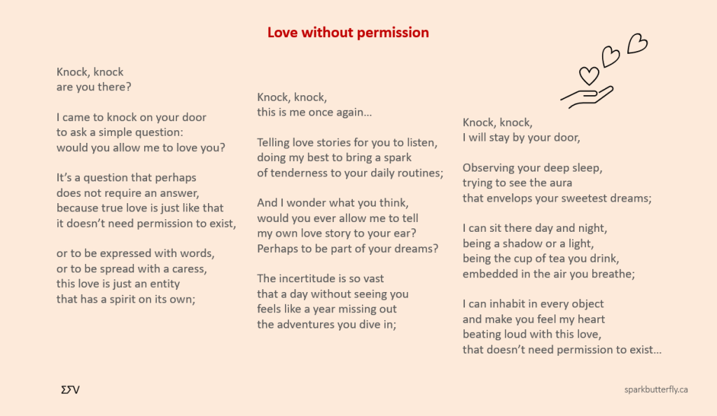 Love without permission 0 January 18, 2025 Written by sparkbutterfly Toronto, December 31, 2024 Share this: Share on Facebook (Opens in new window) Facebook Share on WhatsApp (Opens in new window) WhatsApp Share on LinkedIn (Opens in new window) LinkedIn Share on X (Opens in new window) X Like Loading... Related