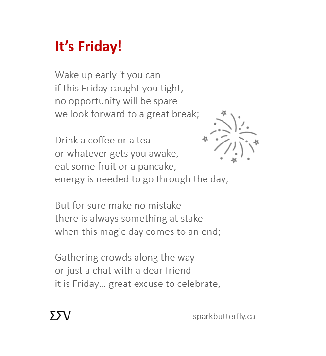 It’s Friday 0 January 24, 2025 Written by sparkbutterfly Toronto, January 24, 2025 Share this: Share on Facebook (Opens in new window) Facebook Share on WhatsApp (Opens in new window) WhatsApp Share on LinkedIn (Opens in new window) LinkedIn Share on X (Opens in new window) X Like Loading... Related