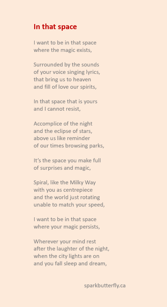 In that space 0 October 29, 2025 Written by sparkbutterfly Toronto, October 15, 2023 Share this: Share on Facebook (Opens in new window) Facebook Share on WhatsApp (Opens in new window) WhatsApp Share on LinkedIn (Opens in new window) LinkedIn Share on X (Opens in new window) X Like Loading... Related
